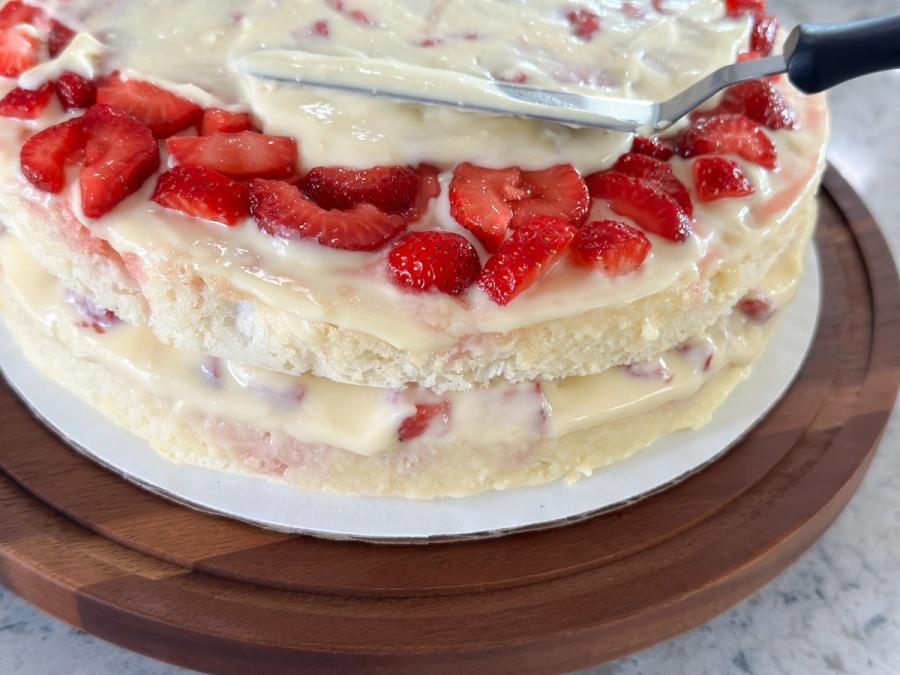 - Spread another thin layer of pastry cream on top of the strawberry filling.